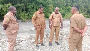 Diskominfomamberamoraya.go.id-Bupati Mamberamo raya Robby Wilson Rumansara mengajak Plt Sekda George Frengki Lilihata dan Plt Kadis Perhubungan Edu Tasti serta Plt Kadis PUPR melihat lebih dekat tahapan progres pembangunan jalan menuju lokasi pelabuhan kapal Logpon Aja Burmeso.